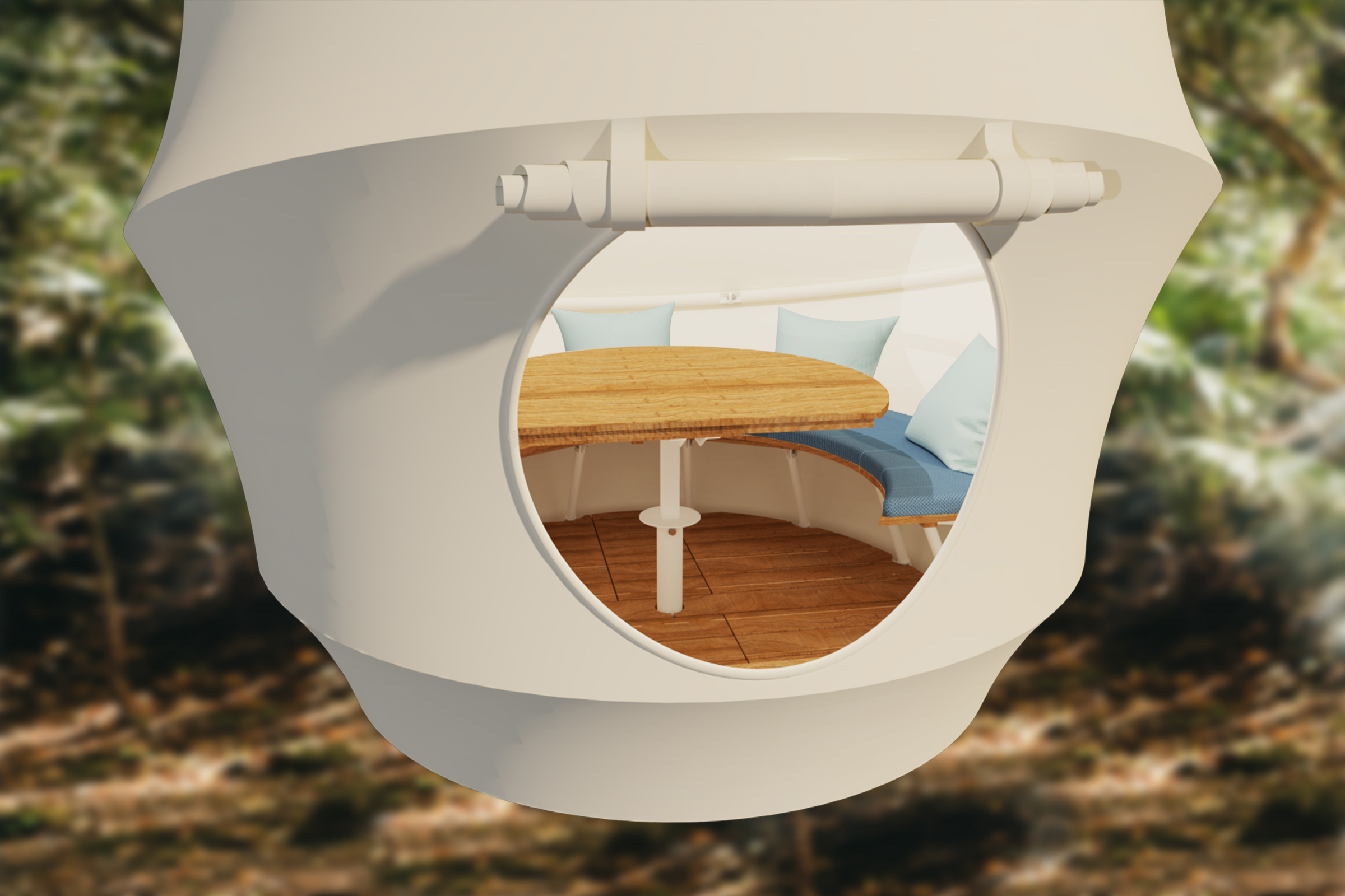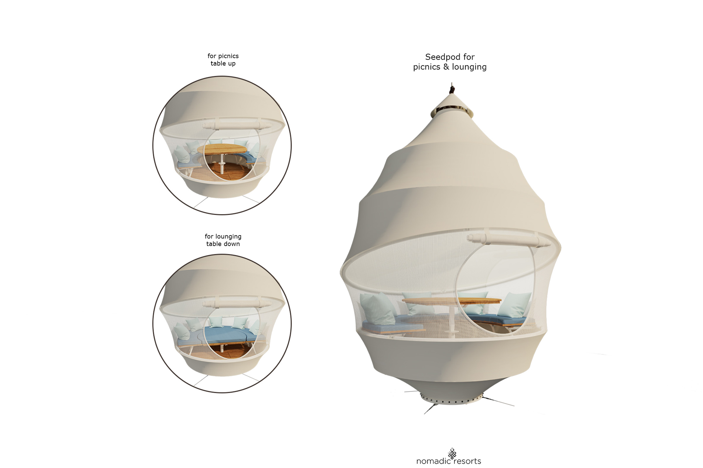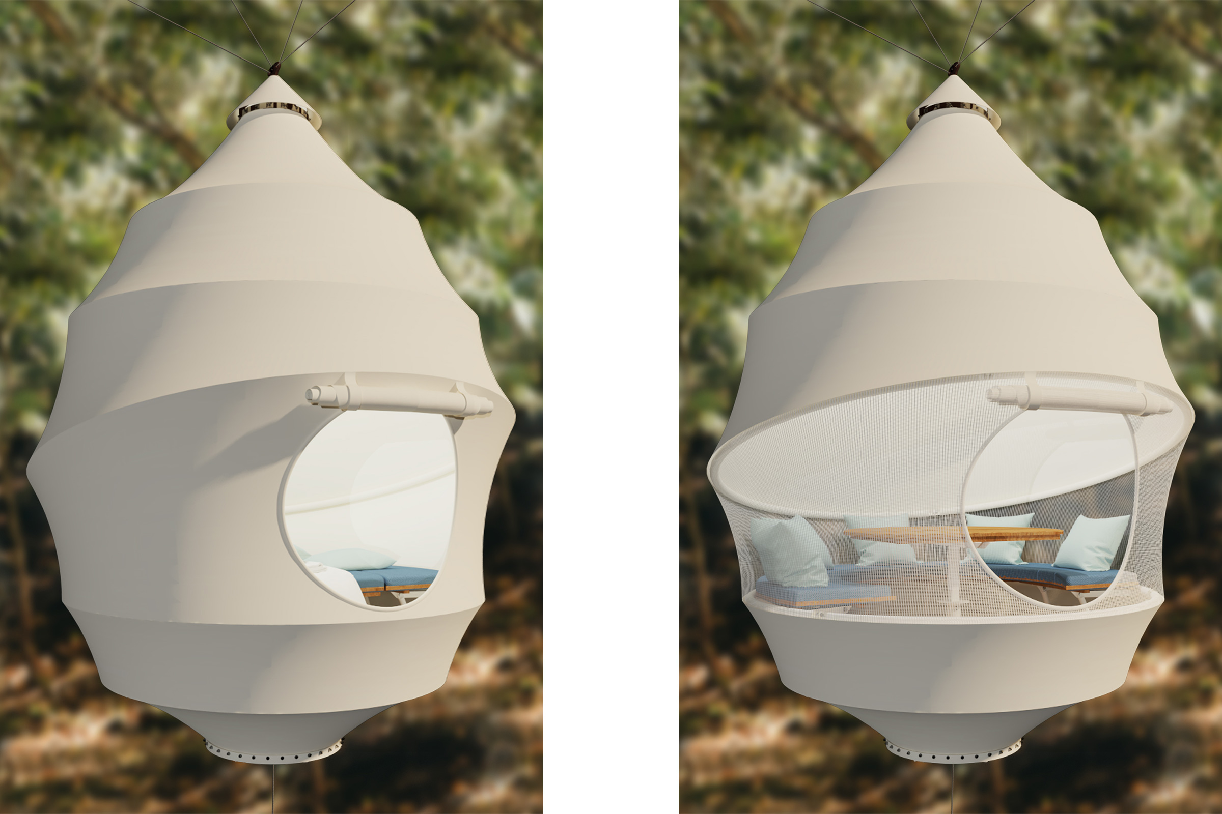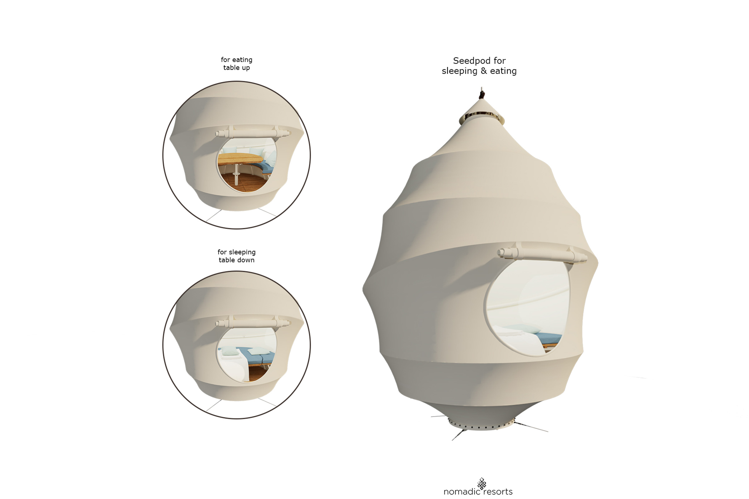 The seemingly ethereal pod is like a real seed, remarkably strong, thanks to its inherently aerodynamic form. The polyvalent structure can be used as a dining experience, floating bedroom, or children’s treehouse.