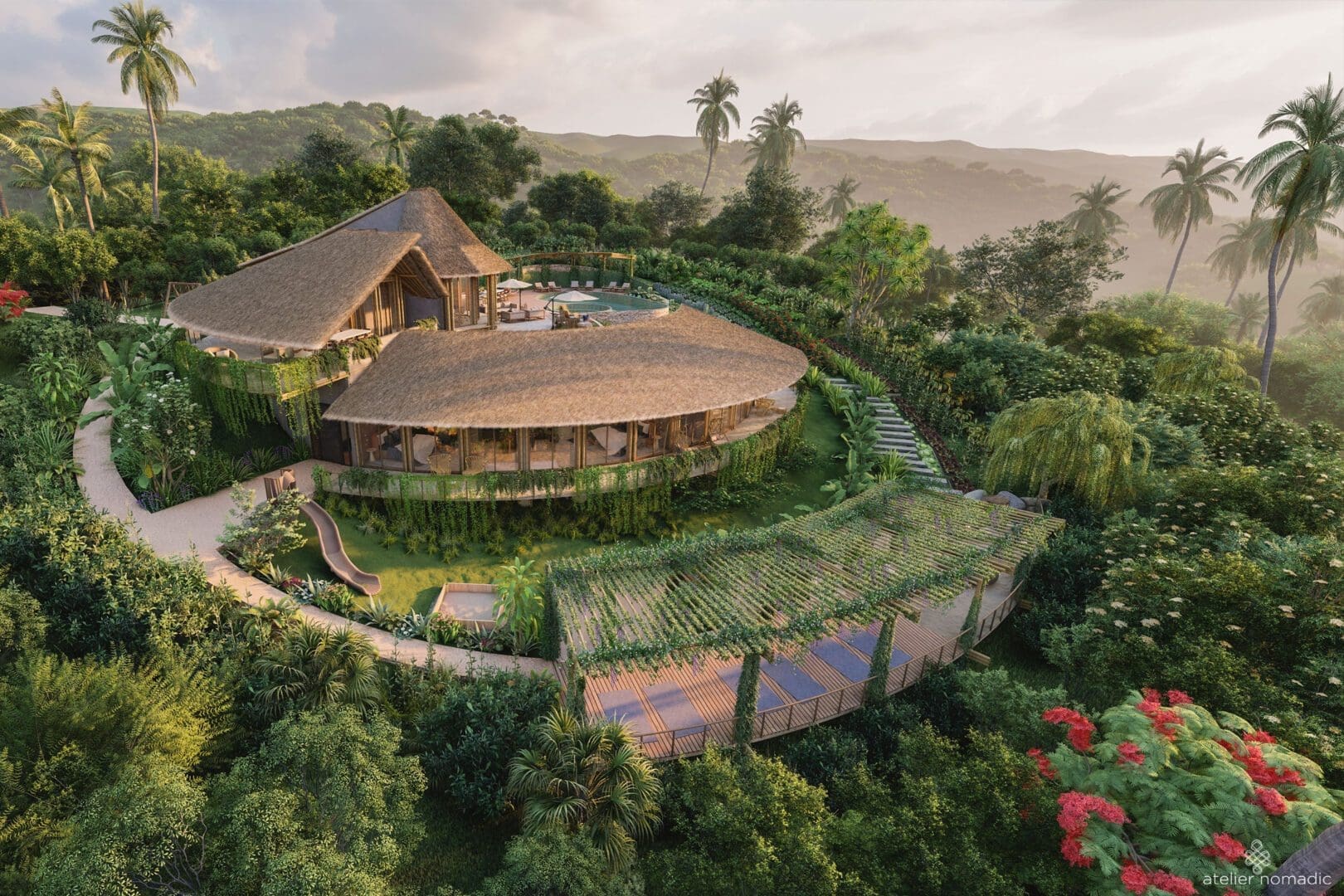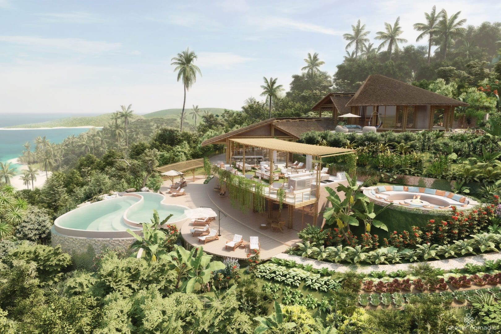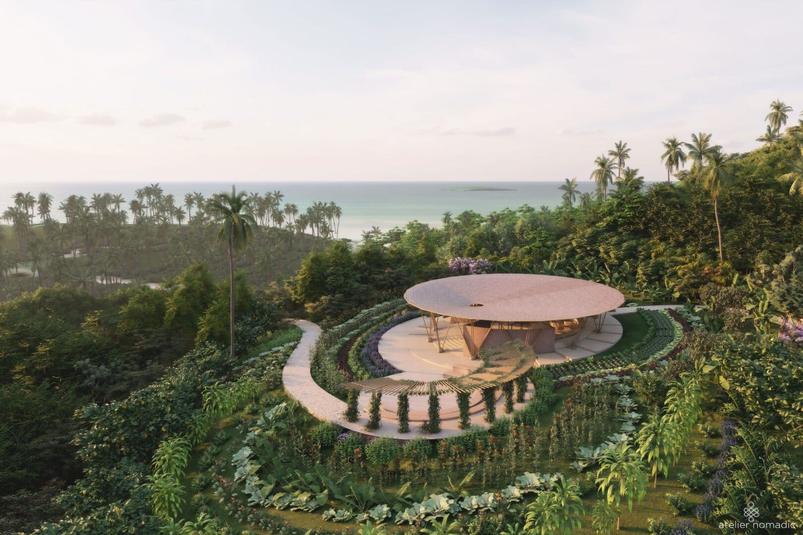 The architecture of the of the project is articulated around a heart-based native education center with an amphitheater for Arts, Music and Well-being programs for both adults and children surrounded by an organic vegetable garden.