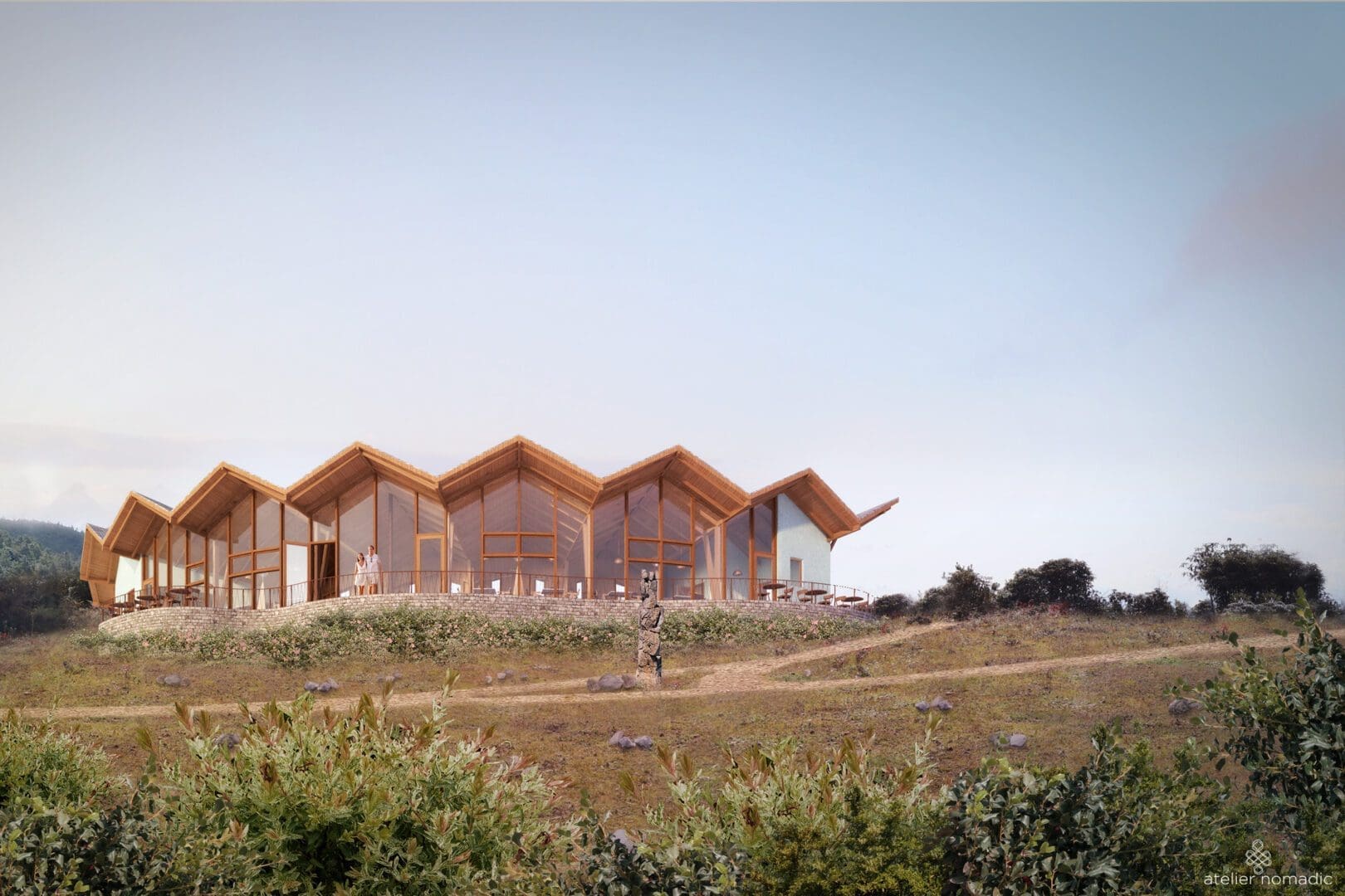 The design of the restaurant mirrors the majestic curves of the Himalayan range, reflecting the harmonious blend of nature and architecture. The restaurant and bar serve a menu that features locally sourced, high-altitude organic foods, blending traditional flavors with modern culinary innovation with a panoramic view over Mount Everest.