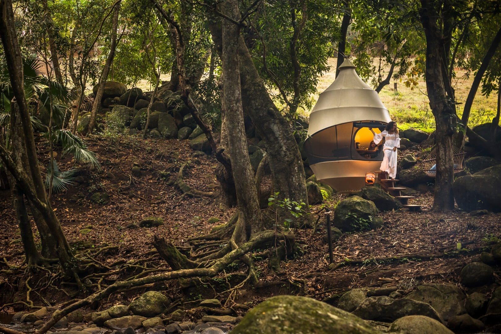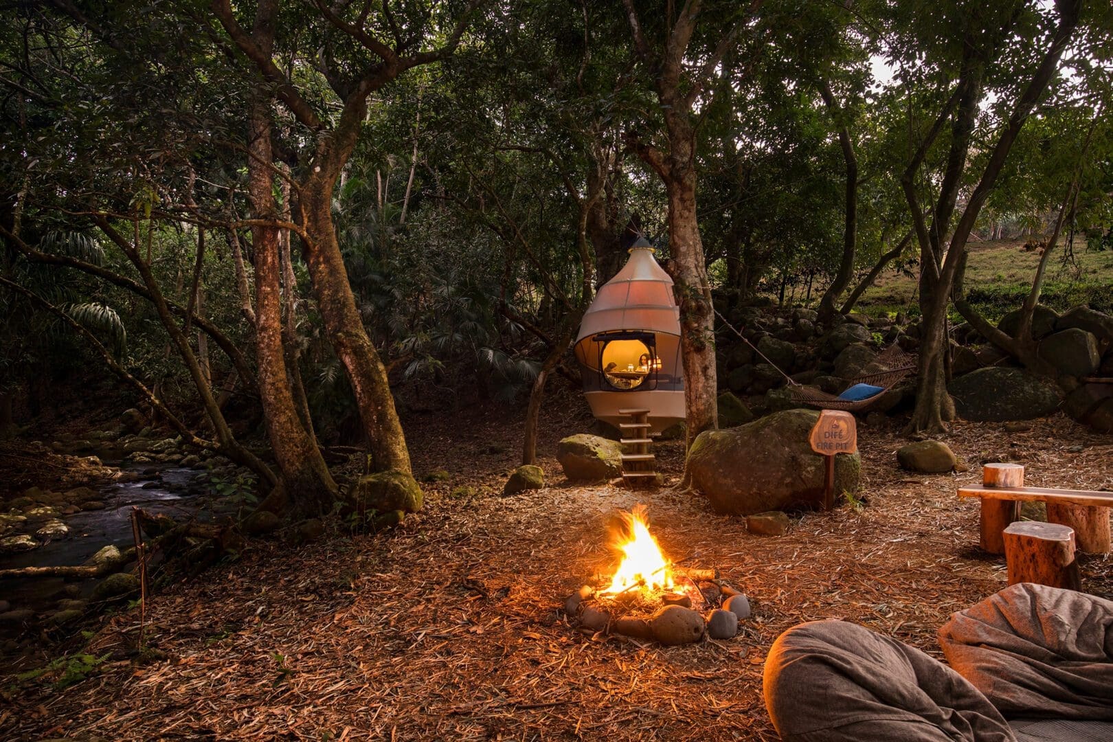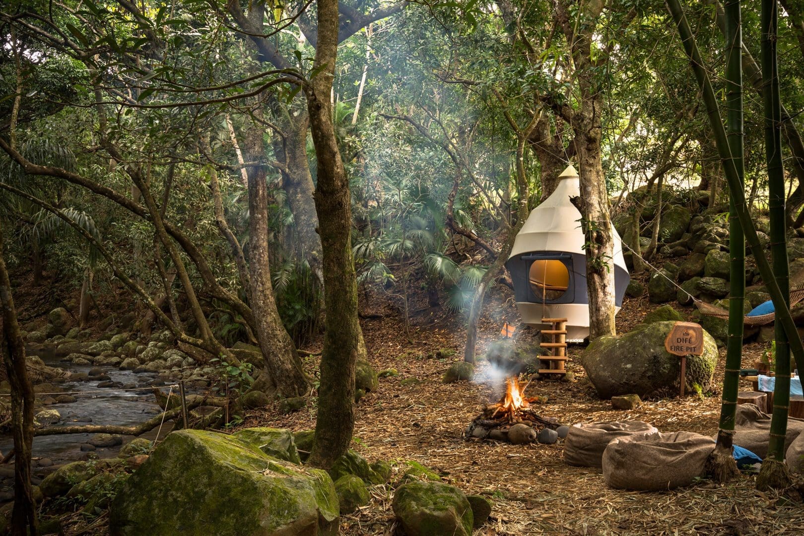 The Heritage Nature Reserve recruited us to create a novel dining experience on the edge of the river so that guests could spend their afternoons lounging by the stream or enjoy a glass of wine without being disturbed by mosquitoes. Two pods were installed using stainless steel cables attached to the existing trees – at Frederica we installed the pod near the foot of the waterfall, and at L’Abbatit we found a site next to a natural pool where a huge tree has created a natural bridge across the stream.