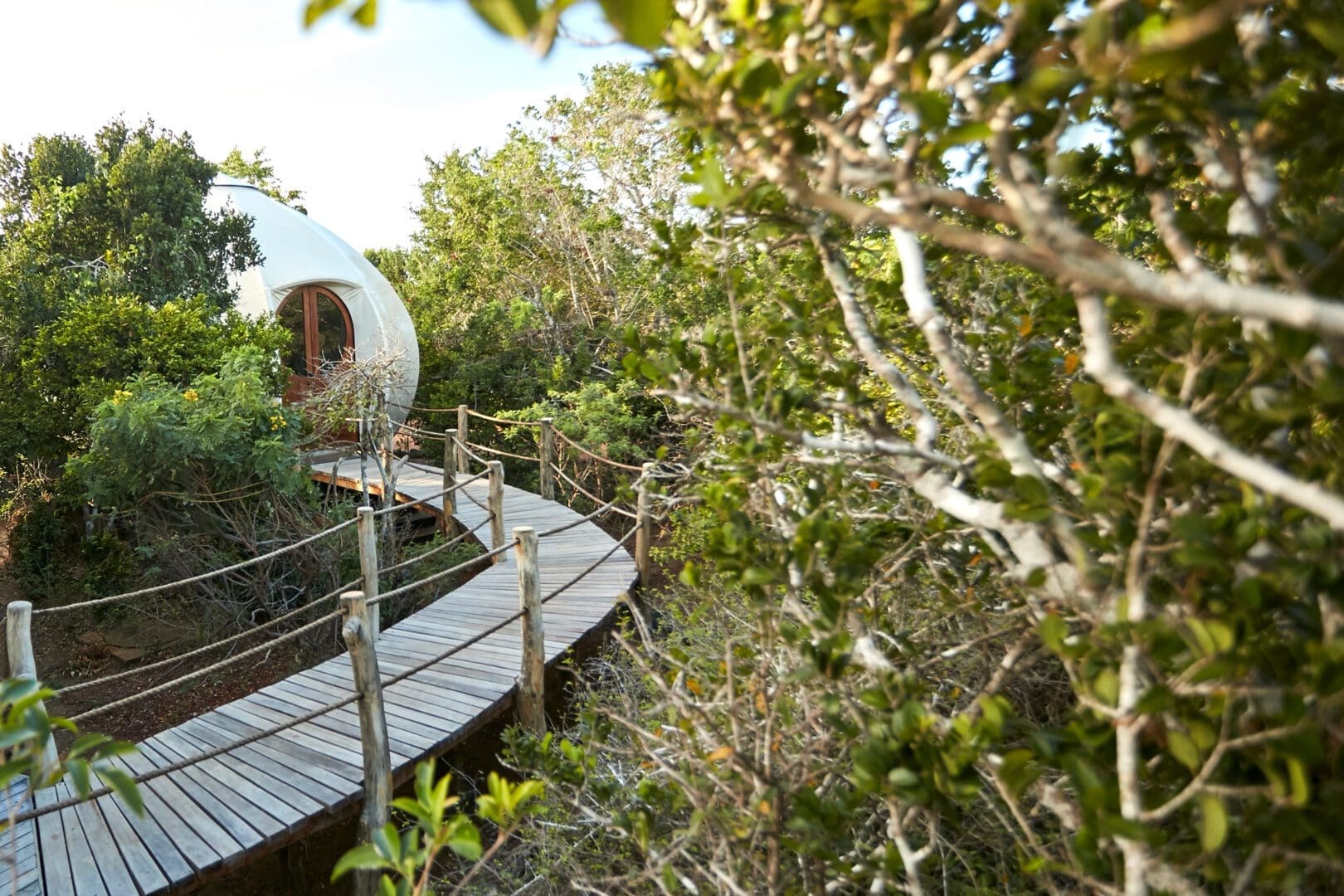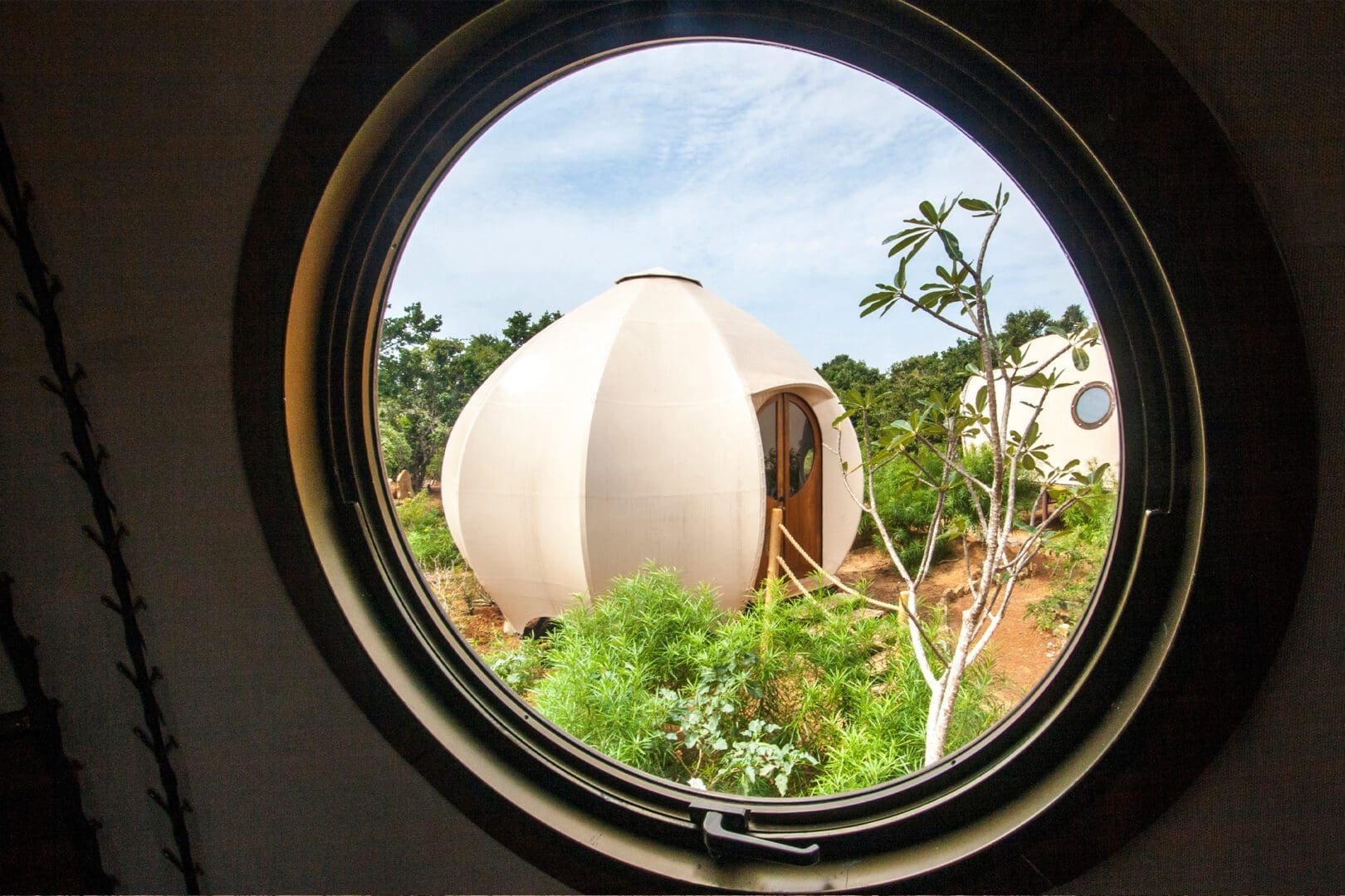 The biophilic design of the compact yet luxury tented pod was inspired by the globular shell of the Sea Urchin – a member of the phylum Echinodermata. As the Urchin matures it develops a five-fold symmetry (called pentamerism) that is reflected in the beamed structure of the tent. Portholes and doors are incorporated into the segments like the tubercules on the shells of the animal to provide access and light.